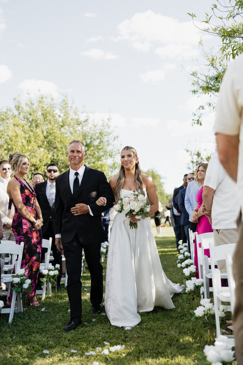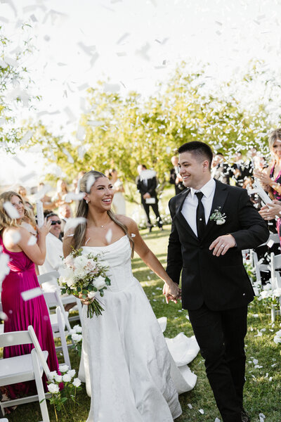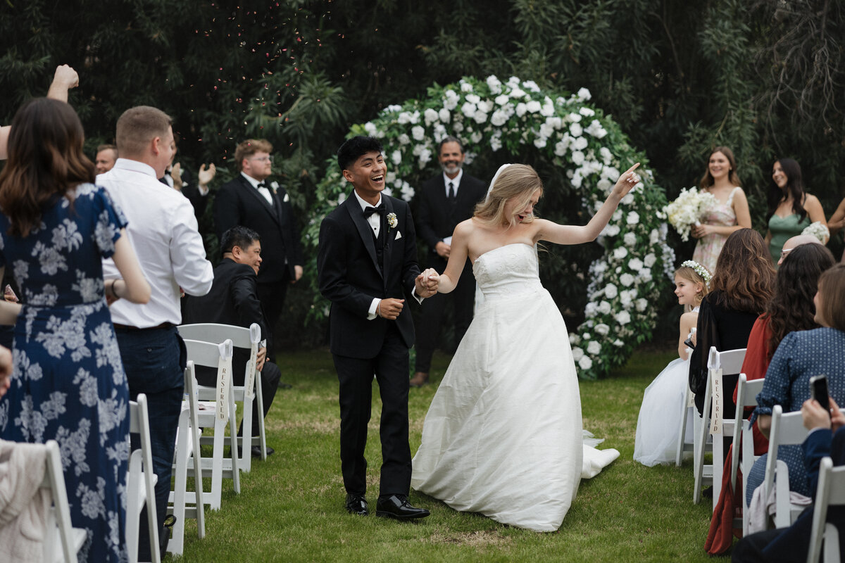 For the best photos, walk down the entire aisle without stopping, while your guests throw confetti or flower petals. To prevent guests from interrupting the moment by hugging or congratulating you, ask your celebrant to announce that congratulations will take place after you have completed the walk.